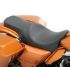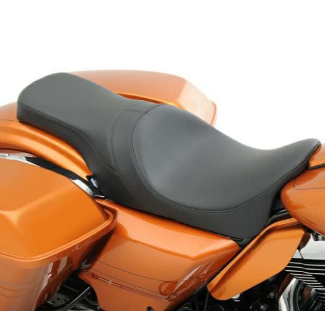 ロープロファイルのツーアップシートです。 ライダーポジションもハンドルバーに近くなりますので、足つき性を良く、かつハンドコントロール、フットコントロールの遠さを解消したい方には最適です。 ライダーポジションはノーマルシートよりも1~2.5インチ(約2.5~6cm)前寄りになります。 ロープロファイルですが、座面は広く、ポリウレタン製のシートフォームと3/16インチ(約4.8mm)厚のABS製シートパンの組み合わせでしっかりとした、快適な座り心地です。 このシートの座面には、太陽光を反射し、温度上昇を抑えるソーラーリフレクティブレザーを使用していますので、夏場でもシートが熱くなりずらく、快適です。 サイド部分は丈夫で手入れの簡単な自動車用ビニールレザーです。 ※CVOモデルへ装着する場合、リアフェンダーのデコレーションパッドを取り除く必要があります。