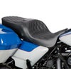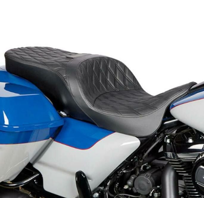 快適性にも優れたスタイリッシュなツーアップシート。 ●ライダー側、パッセンジャー側共に、十分な幅が有り快適性に優れながらも全体的にスタイリッシュな形状のシートです。 ●高さ5-3/4インチ(約14.6cm)のドライバー サポートを備えています。 ●快適性を求めシート幅はワイドですが、前部が細くなっており足つき性も考慮されています。 ●ポリウレタン製のシートフォームと3/16インチ(約4.8mm)厚のABS製シートパンの組み合わせでしっかりとした、快適な座り心地です。 ●純正、又はドラッグスペシャリティーズ製のライダーバックレスト(別売り)の装着が可能です。 ※CVOモデルへ装着する場合、リアフェンダーのデコレーションパッドを取り除く必要があります。
