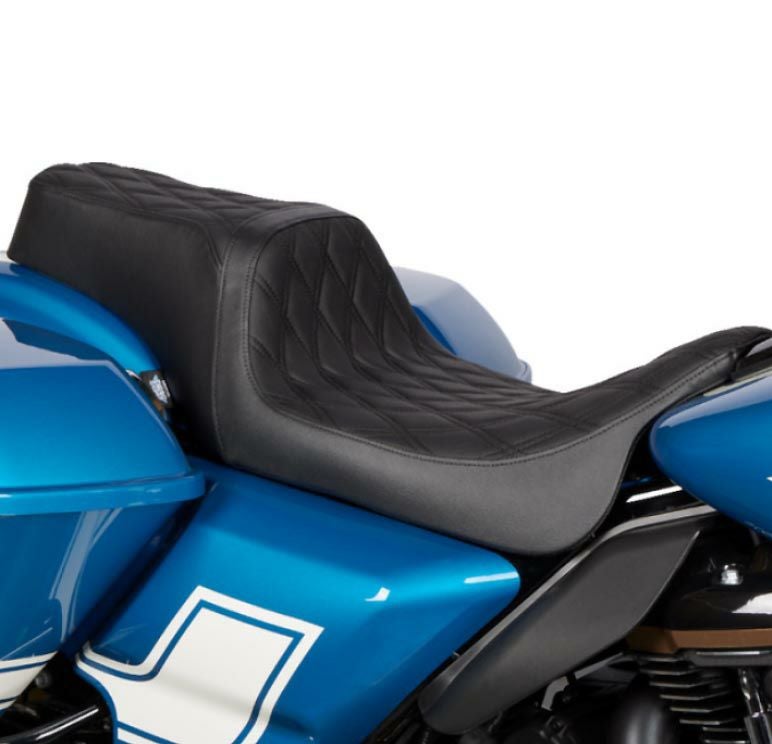 ツーリング用 パフォーマンスバガールック・ソロシートです。 <特長> ●細身のシェイプ。更に絞りこんだフロントで足つき性を向上 ●テールはツーアップシートの趣を残しつつ、ミニマルな細身のデザイン ●自動車部品グレードの高品質ビニールレザーを使用。座面にはアグレッシブなダブルダイアモンドステッチ入り ●モールド成形のポリウレタンシートフォームで快適な座り心地 ●シートパンは厚さ3/16インチ(約4.8mm)の丈夫なABS樹脂製。車体に接する面は傷防止用のカーペット素材カバーとラバーバンパー付