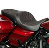 快適性にも優れたスタイリッシュなツーアップシート。 ●ライダー側、パッセンジャー側共に、十分な幅が有り快適性に優れながらも全体的にスタイリッシュな形状のシートです。 ●高さ5-3/4インチ(約14.6cm)のドライバー サポートを備えています。 ●快適性を求めシート幅はワイドですが、前部が細くなっており足つき性も考慮されています。 ●ポリウレタン製のシートフォームと3/16インチ(約4.8mm)厚のABS製シートパンの組み合わせでしっかりとした、快適な座り心地です。 ●純正、又はドラッグスペシャリティーズ製のライダーバックレスト(別売り)の装着が可能です。 ※CVOモデルへ装着する場合、リアフェンダーのデコレーションパッドを取り除く必要があります。
