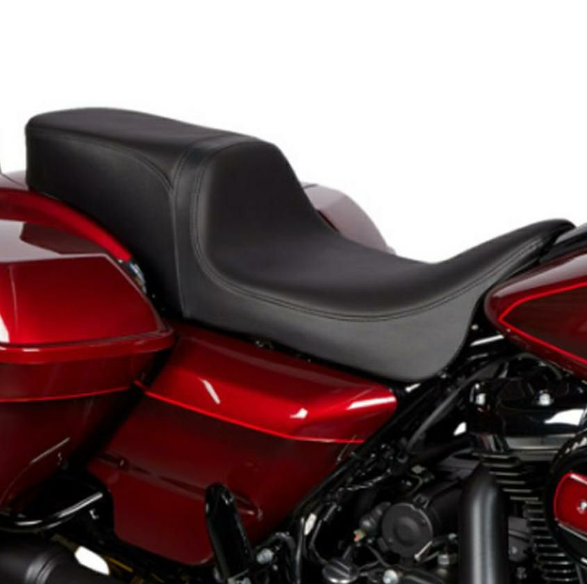 ツーリング用 パフォーマンスバガールック・ツーアップシートです。 ライダー部は低く細身で足付き性がよく取り回しがしやすいシートです。 パッセンジャー部は充分なクッション性を確保しています。 <特長> ●細身のシェイプ。更に絞りこんだフロントで足つき性を向上 ●自動車部品グレードの高品質ビニールレザーを使用。座面はシンプルなスムースデザイン ●モールド成形のポリウレタンシートフォームで快適な座り心地 ●シートパンは厚さ3/16インチ(約4.8mm)の丈夫なABS樹脂製。車体に接する面は傷防止用のカーペット素材カバーとラバーバンパー付