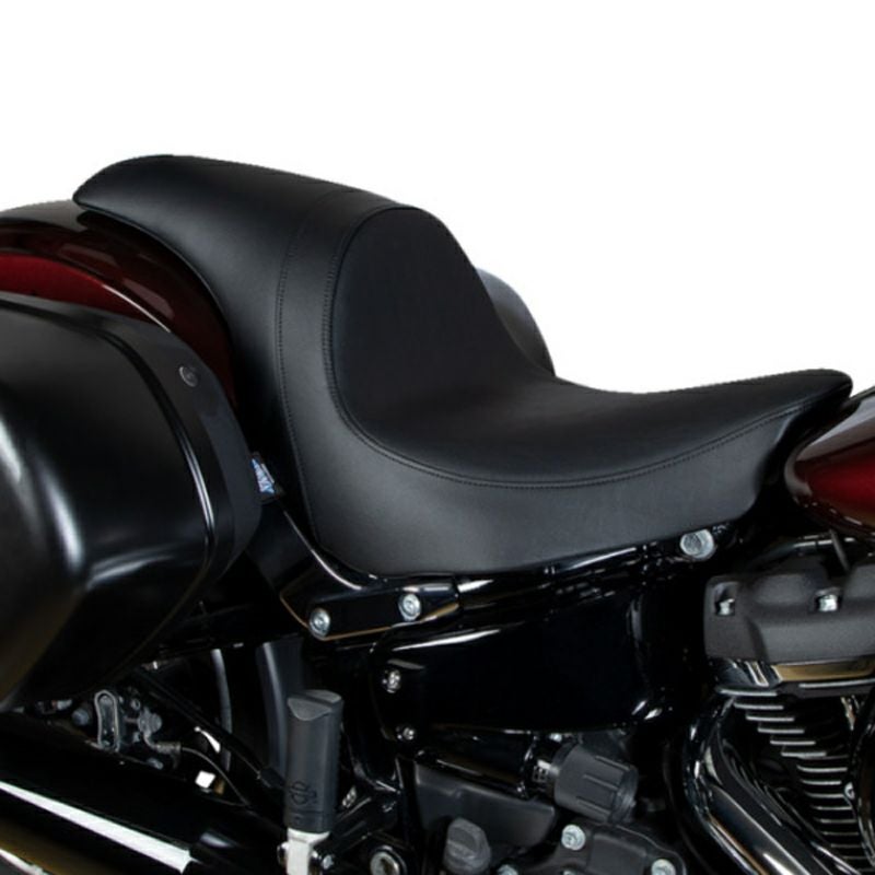 M8ソフテイル ローライダー/S/ST、スポーツグライド用 カスタムシートです。 ファストバックスタイルのスポーティーなルックス。 高さ6.5インチ(約16.5cm)のバックサポートがライダーの腰をしっかりとホールドします。 ノーマルシートよりも1インチ(約2.5cm)低く、先端部が絞り込まれており、足つきが改善します。 シートベースは厚さ3/16インチ(約4.8mm)の丈夫なABS樹脂製。 モールド成形のウレタンシートフォームと共に、ライダーの体重を適度に分散させ、長時間のライディングでも快適な座り心地です。 車体と接する面は傷防止のカーペット貼りとラバーダンパー付きです。 表皮は自動車シートグレードの丈夫なビニールレザー。 手入れが簡単で長期の使用でも質感を維持します。 取付けに必要なハードウェアが付属します。