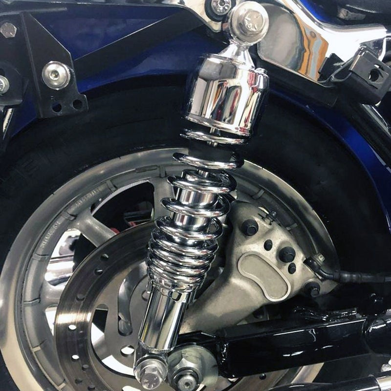 ツーリング用 リアサスペンションです。 ●補修用やカスタム用として最適な、コストパフォーマンスの良いサスペンション ●モノチューブの油圧ダンパーにハードクロームメッキシャフトのシンプルなショックアブソーバー ●スプリングはプログレッシブレート。スムースで快適な乗り心地と、大きな入力に対する踏ん張りを両立 ●プリロード調整付 ●自由長13インチ(約330mm)(マウントボルトホールセンター間) ●クロームボディとクロームスプリングの組み合わせ ●左右ペア ※ノーマルサスペンションと異なる長さのサスペンションを装着する場合、ベルトガードとサスペンションの干渉、リアタイヤとフェンダーのクリアランス、リアホイールアクスルとマフラーの干渉がないか、事前にご確認ください。 ※アッパーショックマウントカバー付の車両はカバーを取り外してください。