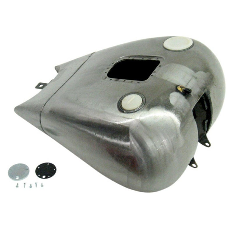 2001~2006 ソフテイル用 ストレッチガソリンタンクです。 <特長> ●インジェクション車用 ●ノーマルより2インチ(約5cm)長いシェイプ ●丈夫な16ゲージ(約1.3mm)厚のスチール製 ●容量5.1ガロン(約19.3リットル) ●ねじ込み式タンクキャップ仕様 ●ノーマル燃料計取付け用穴付(左側) ●未塗装品。好みのカラーにペイントしてください ※ノーマルシートの先端部分はタンクに合わせた加工が必要になります。 ※タンクキャップ、燃料計は付属しません。 ※塗装前に仮組をして適合確認してください。車両とタンクの個体差により、若干の加工調整が必要となる場合があります。 ※塗装前に漏れ防止のシール処理を行ってください。