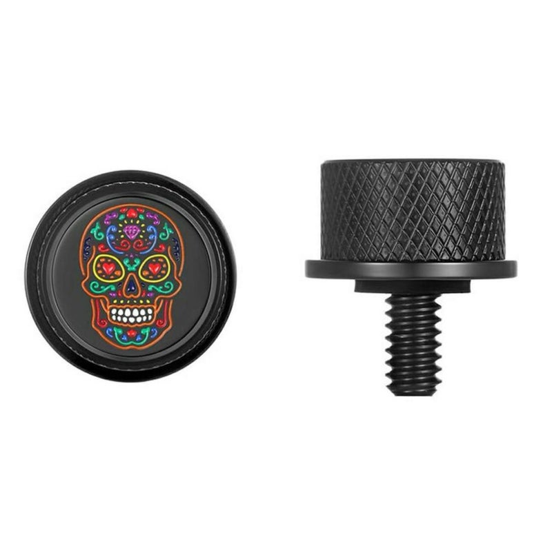スポーツスター、ツーリング、ダイナ、ソフテイル、ストリート 他、多くのハーレーに使用出来るシートボルトです。 <特長> ●愛車に特別な存在感を加える、高級感溢れる製品。一個一個手作業で製作され、ブラックの地ににカラフルなスカルが描かれています ●装飾品や医療用のメス、ハサミにも使われる、高品位サージカルステンレス(316L)を使用。耐食性の高い素材で、いつまでも質感を保ちます ●多くのハーレーで使用される、1/4-20サイズ