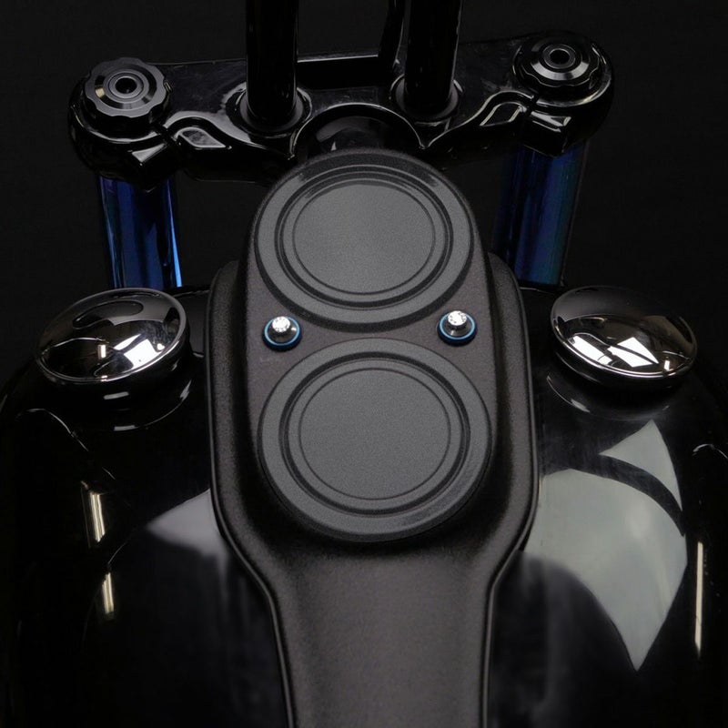 M8ソフテイル ローライダー/S、ダイナ ローライダー/Sのタンクダッシュ2連メーターを移設した際に、タンクダッシュに残った穴をカバーするプレートセットです。 アルミニウム製。 周辺部の大小2本の溝がデザインアクセントです。 取付けはボルトオンで簡単。タンクダッシュをすっきりとドレスアップします。 カバー、ガスケット、スペーサー、ボルトが付属します。 2個セット