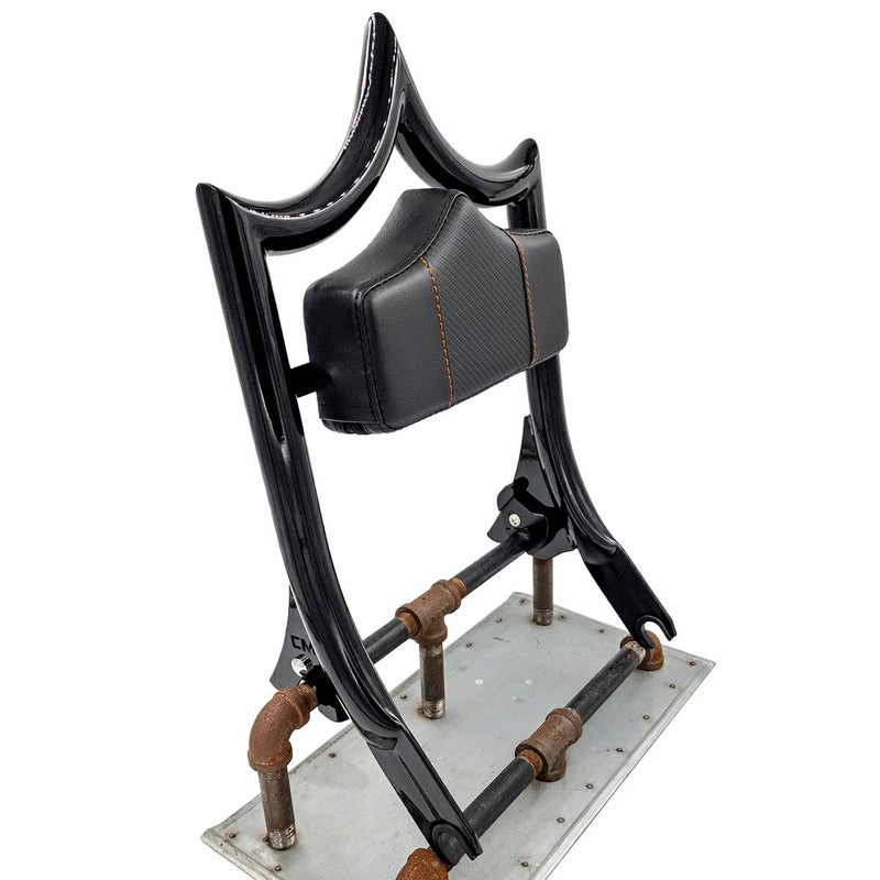 ハーレー 2009以降ツーリング用 パッセンジャーバックレストとバックレストパッドのセットです。 バックレストは迫力ある1.25インチ径パイプとクラウンシェイプが特徴の、EL REY(エルレイ)デザイン。 通常のClassic(クラシック)よりも2インチ高いDOS EQUIS(ドスエキス)=ダブルエックス サイズ。 チカーノスタイルのCMC(カスタムモータースポーツ)らしいネーミングとルックスです。 付属のバックレストパッドはバックレストと同形状。カーボンファイバー柄のセンタートリムを配したデザイン。 オレンジのステッチがアクセント。 同デザインのソロシート・ピリオンパッドのセット(SOSEAT08T-CARFIB-OR)と組み合わせれば愛車をゴージャスにドレスアップ出来ます。 純正ドッキングポイントにワンタッチで着脱出来ます。 脱落防止用アルミ製回転式ラッチ付きです。 ※ご注文時にオプションのカギ付きラッチ(BLK-HDLOCKABLE)を同時購入すればバイクを離れる際の盗難対策も万全です。