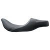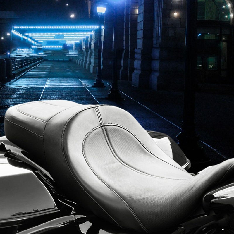 ツーリング用 ツーアップシートです。 ロングツーリングで非常に快適なシート。 座面は広く、腰を包み込むシェイプにより快適に過せます。 ライダーはノーマルシートよりも2インチ程度(約5cm)低いポジションとなり、2インチ(約5cm)後方に座れます。 ライダー、パッセンジャー共にゲル入りで長時間のライディングでも体重を分散させ、快適さを維持します。 シート表皮は船舶部品グレードの耐UV、高耐久ビニールレザーを使用し、手入れが簡単で長期にわたって新品のような風合いを維持します。 座面にはカーボン調のシートパネルを使用し、高級感のあるルックスです。 シートパンは頑丈なファイバーグラス製。車体に接する面はカーペット素材でカバーしてあります。 パネルステッチはブラックです。