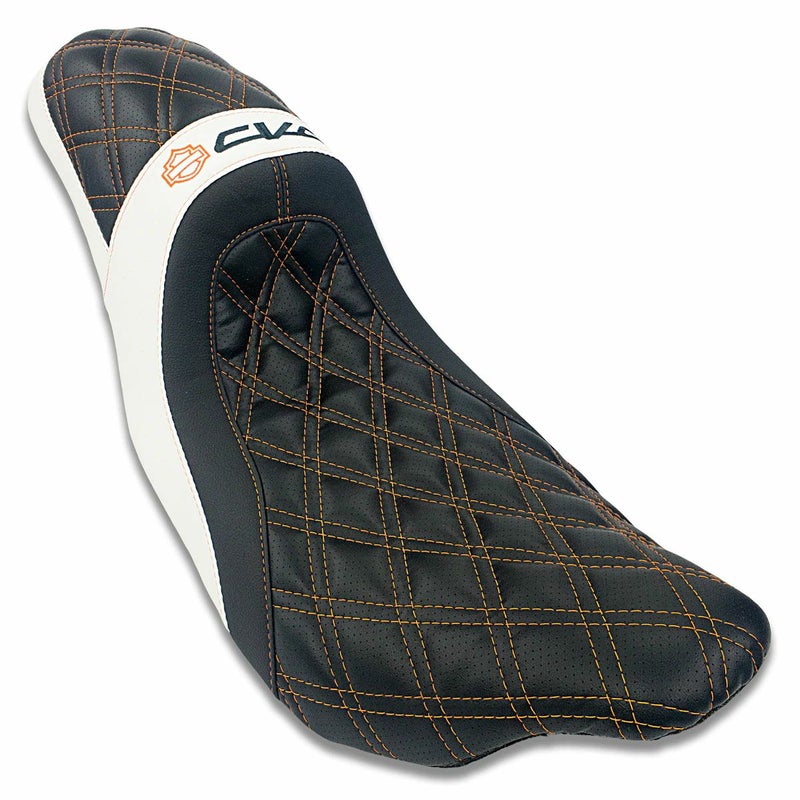 ファストバックスタイルのツーアップシート。 標準装備のシートよりも2インチ(約5cm)後方に座面が来るよう作られています。 ドライバーの腰部はバケット形状になっており、優れたサポート性を持っています。 座面にはダブルダイアモンドステッチが施されており、後部にCVOロゴの刺繍が入っています。 同メーカーのCVOロゴ エルレイ デタッチャブル バックレストシーシーバー等と同デザインです。