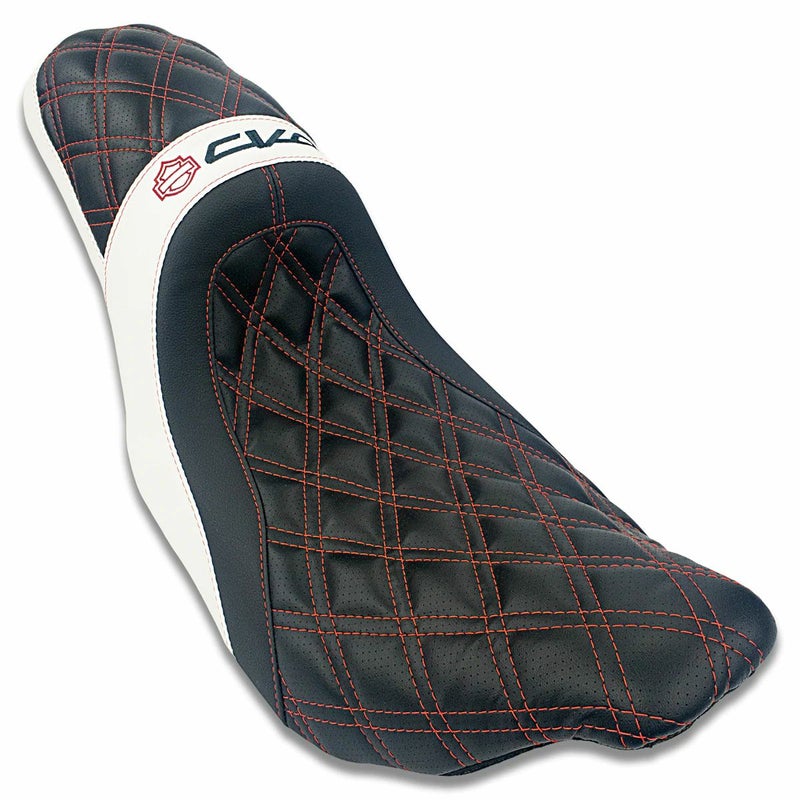 ファストバックスタイルのツーアップシート。 標準装備のシートよりも2インチ(約5cm)後方に座面が来るよう作られています。 ドライバーの腰部はバケット形状になっており、優れたサポート性を持っています。 座面にはダブルダイアモンドステッチが施されており、後部にCVOロゴの刺繍が入っています。 同メーカーのCVOロゴ エルレイ デタッチャブル バックレストシーシーバー(09SCREV1911-AARED)等と同デザインです。