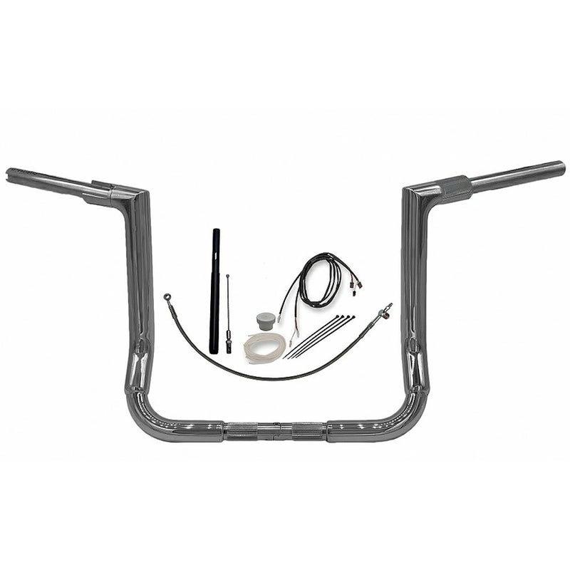 ハーレー エレクトラグライド、ストリートグライド、トライグライド用 エイプハンドルバーと延長ケーブルのキットです。 2021以降のクラッチケーブル車用。 ハンドル装着に必要な延長ケーブルもセットの、コストパフォーマンスに優れたキットです。 太さ1.5インチ径のフラットトップスタイルハンドルバー。 厚さ0.12インチ(約3mm)のヘビーデューティーパイプです。 ハンドコントロール用カラー付ですので、左右ハンドコントロールが1.5インチ径のバーに隙間なくすっきりと収まります。 ハンドルはFat Baggers (ファットバガー)特許取得の2ピース構造のため、配線中通しが大変容易です。 トップコーナー部分は溶接ではなく、一体成型パーツのため、内部がスムースで配線の引っ掛かりがありません。 6インチクラッチ延長ケーブル、延長ブレーキライン、ハンドル延長配線が付属します。