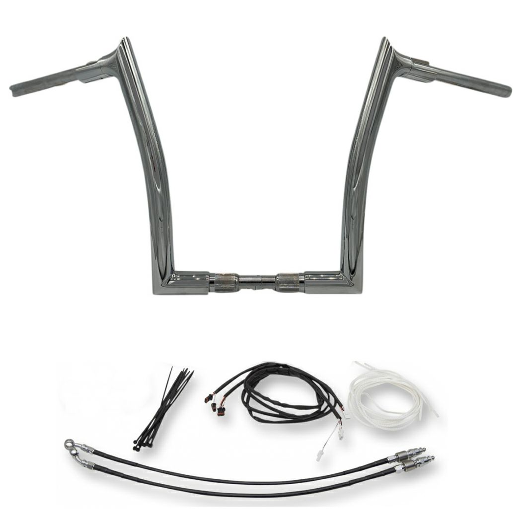 EZインストールハンドルバーと、延長ケーブルのセットです。 ノーマルのハンドルバーから交換した際に必要な、クラッチホース、ブレーキホースおよびCAN-BUS配線(全て延長部分のみ)が付属します。 ※ノーマルのケーブル類はそのまま流用します。 ハンドルは2ピース方式で簡単に配線中通しが可能なハンドルバー。 ハンドル径は迫力ある1.5インチ径。 ライズ部分トップが尖ったシャープなデザインです。 ハンドコントロール横部分には1.5インチ径のカラー付きで、油圧マスターシリンダーの位置に合わせて回転させることが出来ます。 トップはビレット素材からのCNCマシン削り出し。内部もCNCマシンで滑らかにカットされているため、配線が引っかかりません。 ハンドコントロール部は1インチ径。 ライザークランプ部は1.25インチ径で、2017以降のロードキングスペシャルに合わせたサイズです。 素材は0.12インチ(約3mm)厚のスチールパイプ。CNCマンドレル曲げで製作しています。