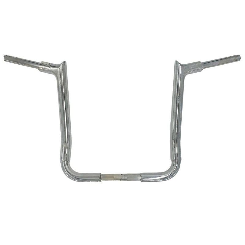 ハーレー FLH ツーリング、トライグライド用の1-1/2インチ径、エイプハンドルバーです。 ファットバガー特許取得のEZインストール構造。センターで2ピースに分割できます。 トップ部分の尖りは一体成型されており溶接ではなく、内部はスムースで配線中通しが楽に行えます。 ※純正ヒートグリップ装着可 厚さ0.12インチ(約3mm)の頑丈なスチールパイプ製。 メイン部分は迫力の1.5インチ径。 高さは16インチ(約41cm)。 フロントブレーキマスターシリンダー用の切り欠き付カラーにより、装着時にハンドコントロール周りのルックスがタイトに決まります。 クラッチケーブル車用。(左カラーにマスターシリンダー用の切り欠き無し) ハンドル右端に電子制御スロットル用切り欠き付です。
