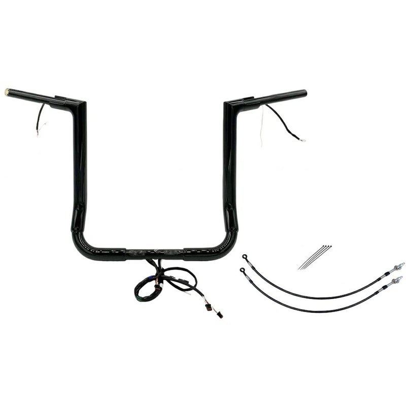 エレクトラグライド、ストリートグライド、トライグライド用 配線中通し済み フラットトップ・ハンドルバーキットです。 2015以前用スロットルセンサー配線、Can-Busスイッチ配線が中通しされており、面倒な配線中通し作業の手間が省けます。 ハンドルバーはFat Baggers(ファットバガー)特許のツーピース構造。 コーナー部分が溶接の無いビレットスチール一体構造で中がスムースなため、配線が引っかかりません。 迫力の1.5インチ径。肉厚0.095インチ(約2.4mm)の頑丈なスチールパイプ製。ノーマルのハンドコントロール、リザーバータンクが綺麗に収まるカラーが付属します。 油圧クラッチ車用。 クラッチライン(延長部分)およびブレーキホース(アッパー部分)も付属しますので、このキットがあればハンドル交換が比較的簡単に完成します。 ※純正ヒートグリップも対応可能ですが、ヒートグリップ用延長配線(2120-0917)は別売です。