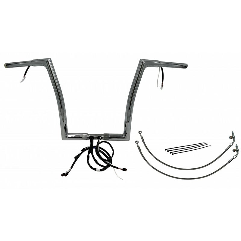 ロードグライド用 配線中通し済みハンドルバーキットです。 2015モデル用スロットルセンサー配線、Can-Busスイッチ配線が中通しされており、面倒な配線中通し作業の手間が省けます。 ハンドルバーはFat Baggers(ファットバガー)特許のツーピース構造。 コーナー部分が溶接の無いビレットスチール一体構造で中がスムースなため、配線が引っかかりません。 迫力の1.25インチ径。肉厚0.12インチ(約3mm)の頑丈なスチールパイプ製。 油圧クラッチ車用。 クラッチライン(延長部分)およびブレーキホース(アッパー部分)も付属しますので、このキットがあればハンドル交換が比較的簡単に完成します。 ※純正ヒートグリップも対応可能ですが、ヒートグリップ用延長配線(2120-0917)は別売です。