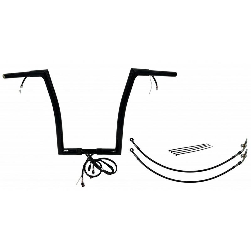 ロードグライド用 配線中通し済みハンドルバーキットです。 2016以降用スロットルセンサー配線、Can-Busスイッチ配線が中通しされており、面倒な配線中通し作業の手間が省けます。 ハンドルバーはFat Baggers(ファットバガー)特許のツーピース構造。 コーナー部分が溶接の無いビレットスチール一体構造で中がスムースなため、配線が引っかかりません。 迫力の1.25インチ径。肉厚0.12インチ(約3mm)の頑丈なスチールパイプ製。 油圧クラッチ車用。 クラッチライン(延長部分)およびブレーキホース(アッパー部分)も付属しますので、このキットがあればハンドル交換が比較的簡単に完成します。 ※純正ヒートグリップも対応可能ですが、ヒートグリップ用延長配線(2120-0917)は別売です。