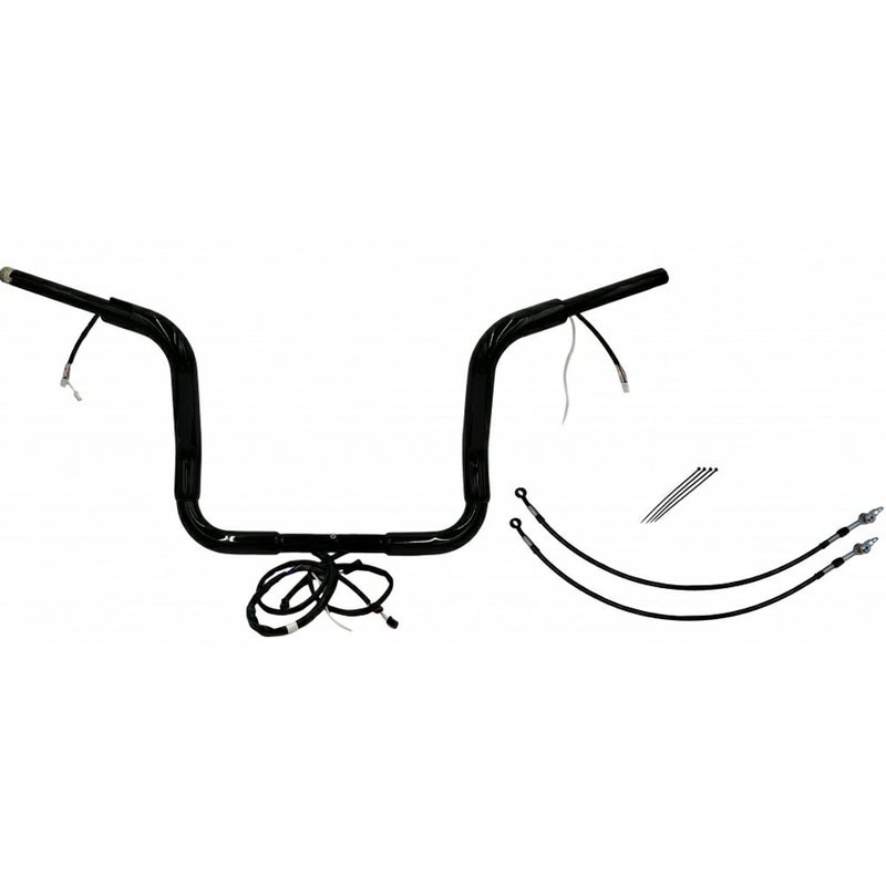 エレクトラグライド、ストリートグライド、トライグライド用 配線中通し済みハンドルバーキットです。 2015以前用スロットルセンサー配線、Can-Busスイッチ配線が中通しされており、面倒な配線中通し作業の手間が省けます。 ハンドルバーはFat Baggers(ファットバガー)特許のツーピース構造。 コーナー部分が溶接の無いビレットスチール一体構造で中がスムースなため、配線が引っかかりません。 迫力の1.5インチ径。肉厚0.095インチ(約2.4mm)の頑丈なスチールパイプ製。ノーマルのハンドコントロール、リザーバータンクが綺麗に収まるカラーが付属します。 油圧クラッチ車用。 クラッチライン(延長部分)およびブレーキホース(アッパー部分)も付属しますので、このキットがあればハンドル交換が比較的簡単に完成します。 ※純正ヒートグリップも対応可能ですが、ヒートグリップ用延長配線(2120-0917)は別売です。