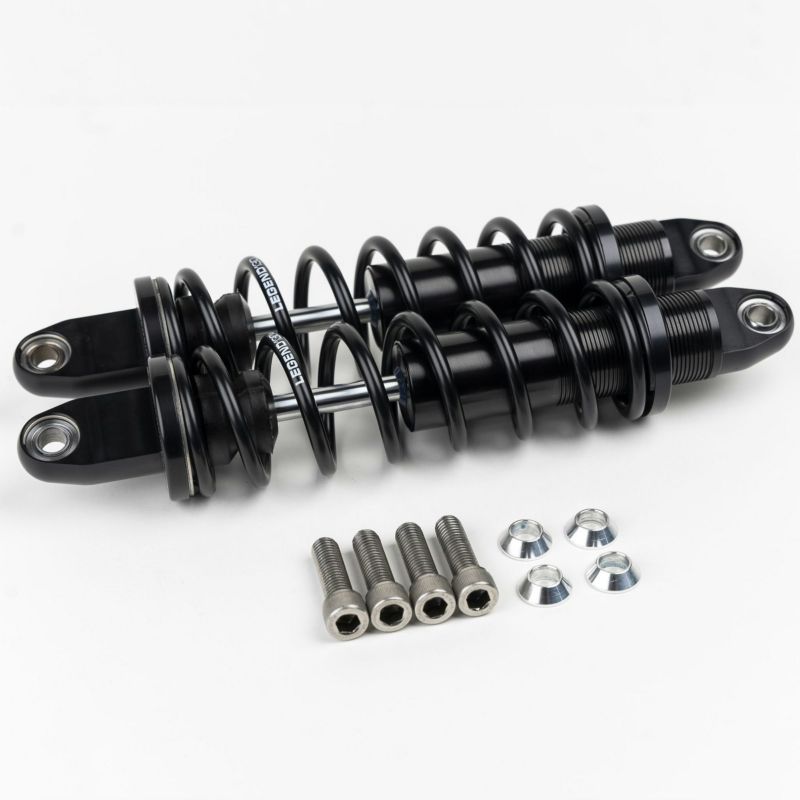 M8 トライグライド、ロードグライド3、フリーホイーラー用 ヘビーデューティー・高性能リアサスペンションです。 <特長> ●ノーマルのリアショックロワーマウントとの組み合わせで、最大のリフト量を実現 ●硬めのスプリングを使用。独自のスプリングレートにより快適な乗り心地と路面追従性の向上を実現。大きな入力に対しては踏ん張りが効き、底付きしずらい特性 ●独自のプリロードアジャスター機構を採用。同長の他社製ショックアブソーバーよりも長いスプリングを使用し、乗り心地を向上 ●プリロードアジャスター付。工具なしで手で調整可能 ●ダンパーは摩擦抵抗の少ないピストンとディスク式バルブでスムースな作動と最適なダンピング特性を発揮 ●マウント部には首振り式ベアリングを採用。サスペンションの動きにフレキシブルに追従し、ラバーブッシュより長寿命 ●スプリングとダンパーボディはブラックカラーのハードコートアルマイト仕上げ ●米国製 ●左右ペア ※リアリフトアップキットとの組み合わせ不可