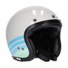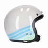 軽量でタイトなルックスのジェットヘルメットです。 頭のサイズに応じた4種類の帽体サイズ設計で、ヘルメットの外径がすっきりと見えます。 カラーは明るいライト・グレーにライトブルーのグラフィック。街中で映えるカラーです。 縁取りはブラックカラー。 バイザー/シールド用スナップ付き。 ブラックのバイザーが付属します。 帽体はグラスファイバー製。 EPS(発泡スチロール)ライナー付。 内装は肌触りの良いフリースライナーと、クラシックテイストのレザーの組み合わせです。 チンストラップはダブルDリング仕様。 ECE-R22.05安全規格適合品。 ※日本では装飾品扱いとなります。 ※EUサイズのため、日本サイズより1-2サイズ以上大きめをお選びください。