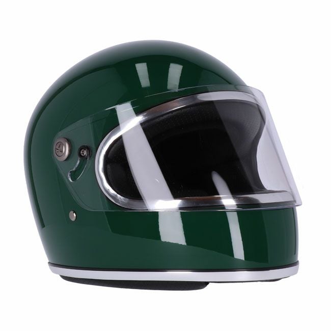 様々な環境で使い勝手の良い、レトロテイストのフルフェイスヘルメットです。 余分な装飾や突起の無い、クリーンな飽きの来ない外観。 フリップ式バイザー付きですので、どのような環境でも手軽に使えます。 カラーはノスタルジックな雰囲気の、深みのあるジョンディア・グリーン。 クロームの縁取りがレトロな雰囲気です。 帽体は軽量・頑丈なグラスファイバー製。 EPS(発泡スチロール)ライナー付。 バイザーは丈夫なポリカーボネイト製。傷防止加工と、曇り止め加工も施されています。 内装は肌触りの良いフリースライナーと、レトロなパンチングレザーの組み合わせ。 ライナーは脱着式で洗濯可能。 チンストラップはダブルDリング式。 ECE-R22.05安全規格適合品。 ※日本では装飾品扱いとなります。 ※EUサイズのため、日本サイズより1-2サイズ以上大きめをお選びください。
