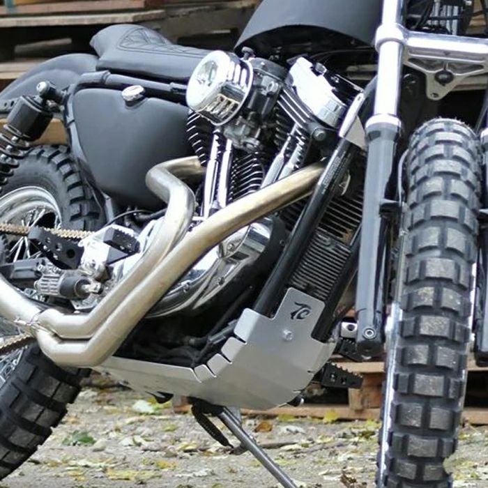 ハーレー 1991~2003 スポーツスター用 スキッドプレート(エンジンアンダーガード)です。 走行中の撥ね石や障害物によるダメージから、エンジン下部を守ります。 フラットトラックレーサー、スクランブラータイプカスタムには必須アイテムです。 アルミニウム製。 取付け用ブラケット、ハードウェアが付属します。