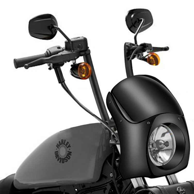 スポーツスター、ダイナ、ソフテイル 他、ケーブルスロットル車用 クラシックテイストのミニエイプバーです。 頑丈なスチール製。 ナロー幅のタイトなルックスです。 エンドライズは9インチ(約23cm) グリップ部は握り易い角度で、手首が疲れません。 マットブラック塗装仕上げ。 配線中通し用の穴が開いています。 ケーブルスロットル車用 ※購入前に、取り付け車両のトップクランプ幅に干渉しないかご確認下さい。