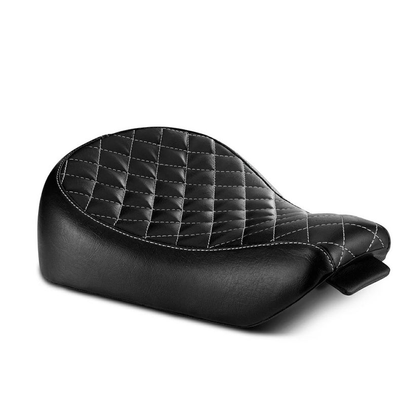 スポーツスター用 ソロシートです。 クラシックチョッパー風のシンプルでスリムなルックス。 お尻を包み込むような座面シェイプが快適な座り心地です。 座面にはレトロなダイアモンドステッチ入り。ホワイトのステッチがアクセントになっています。 シートパンはスチール製。グラスファイバーで補強してあります。 シートフォームは型崩れしにくい素材を使用しています。 取付けはフロントのベロをタンクの下に入れ、リアをシートナット、シートボルトで固定します。 (シートナット、シートボルトは付属しません)