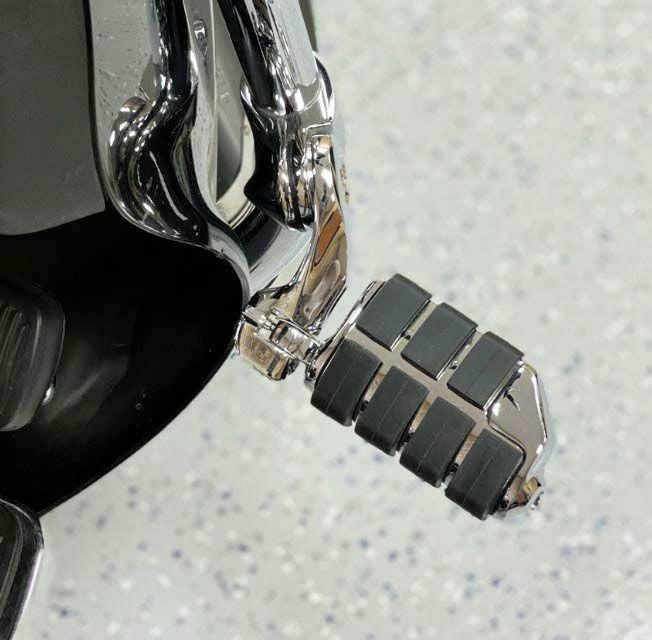 取り付け簡単なハイウェイペグ、マウントのセット。 アジャスタブルハイウェイペグにはショート・タイプとロング・タイプがあり、アームの長さが異なります。 ロングタイプはアームが長いので後にセットすればかなり手前(フットボードの横近く)にペグが来て、前にセットすればかなり前方にペグがセットします。 ショートタイプはアームが短めなので、前後の調整範囲は少なくなりますが、上下方向に調整した時にはあまり上すぎず、下すぎない範囲で調整できるので、多くの日本人には後方にセットして上下に調整すればエンジンガードより後方に足を置けます。 アームはアングル調整可能。 クランプは1.25インチ径。 アーム長さは2.5インチ(約6cm)。 取付位置やアーム、ペグの角度を調整して好みのポジションを作ることが出来ます。 フットペグは滑り止めのラバー付です。 左右ペア