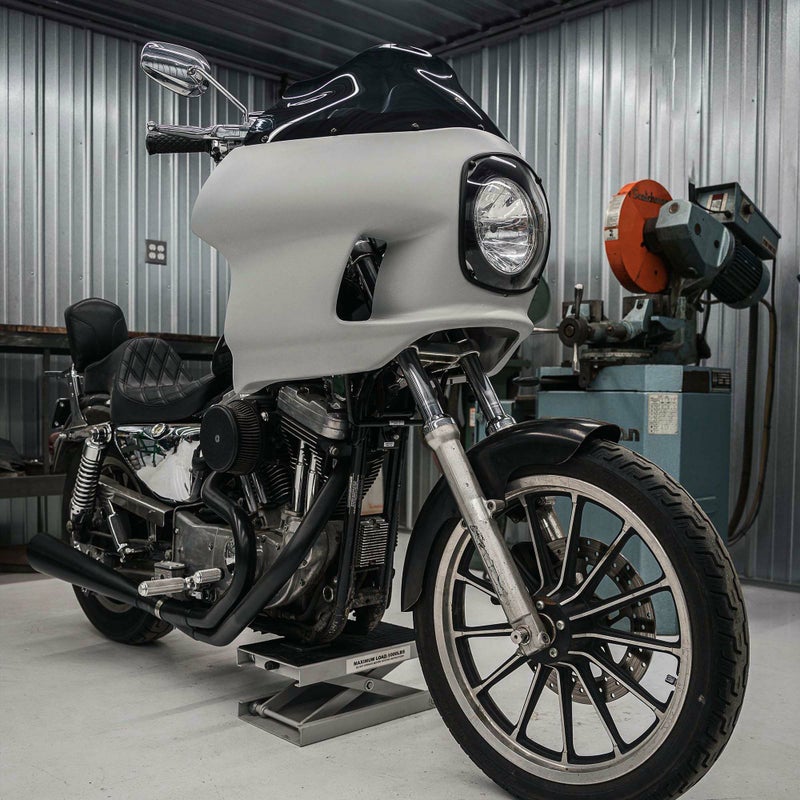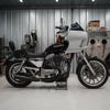 1986~2003 スポーツスター用 FXRPスタイルのフェアリングキットです。 <特長> ●往年の名車FXRP(スーパーグライドポリス)のフェアリングを忠実に再現したフレームマウントフェアリングキット。快適なスポーツクルージングを楽しめます ●フェアリングは頑丈なグラスファイバー製 ●未塗装品。好みのカラーにペイントしてください ●マウントブラケットは車種専用設計。パウダーコート塗装仕上げ ●7インチヘッドライト用マウント付 ●クリアのヘッドライトカバー付 ●ダークスモークカラーの9インチ・フレアウィンドシールド付属 ●取付けに必要なハードウェア類が付属します ●ペイントに合わせてスクリーンのカラーを変えたい方は、別売の専用カラーフレアウィンドシールド(SEL-KWW-02-0618)を装着出来ます ※7インチヘッドライトが別途必要です ※フロントウィンカーは移設する必要があります ※フェアリングと装着のハンドルが干渉しないか等、ペイント前に仮組状態で確認してください ※8.5インチトール以上のプルバックライザーがお勧めです。Tハンドルバー、ナローエイプハンドルも干渉を回避できる場合があります。