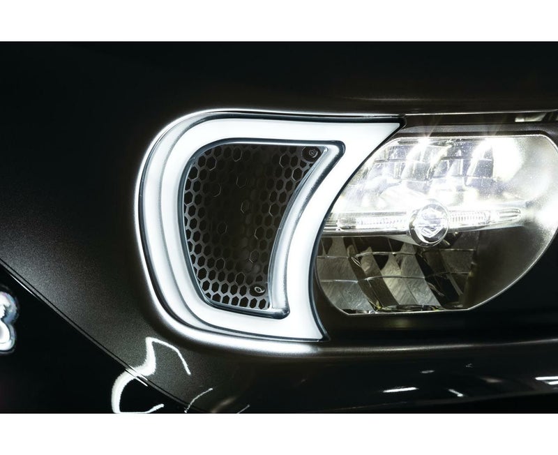 トレイサーシリーズのトリムライト。 通常走行時は白色デイライトで他車からの視認性が大幅に向上します。 ウインカー作動時はアンバー発光に切り替わり、ウインカーが消灯すると白色デイライトに再度切り替わります。 ヘッドライト脇のベント部分に取り付けるので違和感なくスッキリと装着出来ます。 また、エアーベント部分はメッシュ構造になっており、エアーの吸入の邪魔になりません。 配線はカプラーオンで取り付け可能。