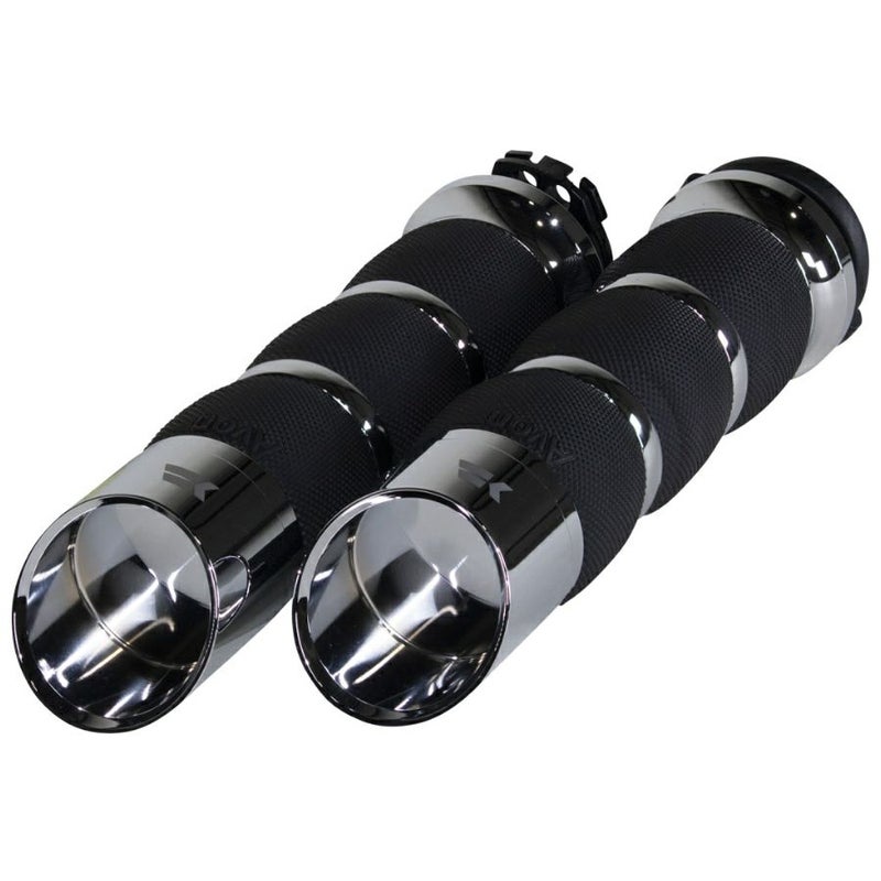 ハーレー用 ハンドグリップセットです。 ケーブルスロットル用。 グリップ部分は握り心地の良いラバーに、二本リングのついたエアクッションシェイプ。 エンド部分は斜めにカットされた大胆なエッジデザイン。 ゴージャスなクロームフィニッシュ。 同デザインのマフラーエンドキャップと組み合わせると統一感のあるルックスになります。 左右ペア