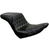 ハーレー M8ソフテイル ローライダー、ローライダー S/ST、エルディアブロ、スポーツグライド用 2UPシートです。 バックサポートが高く切り立ったKick Flip(キックフリップ)デザイン。 急加速やアクティブなライディングの際にライダーの腰をしっかりとサポートします。また、スタントライディングの際もシート後端に足をかけやすい形状です。 座面にはダブルダイアモンドステッチ入りです。 ステッチカラーは落ち着いた趣のあるチェスナットブラウン。ブラックやグレーの車体にアクセントカラーとして映えます。