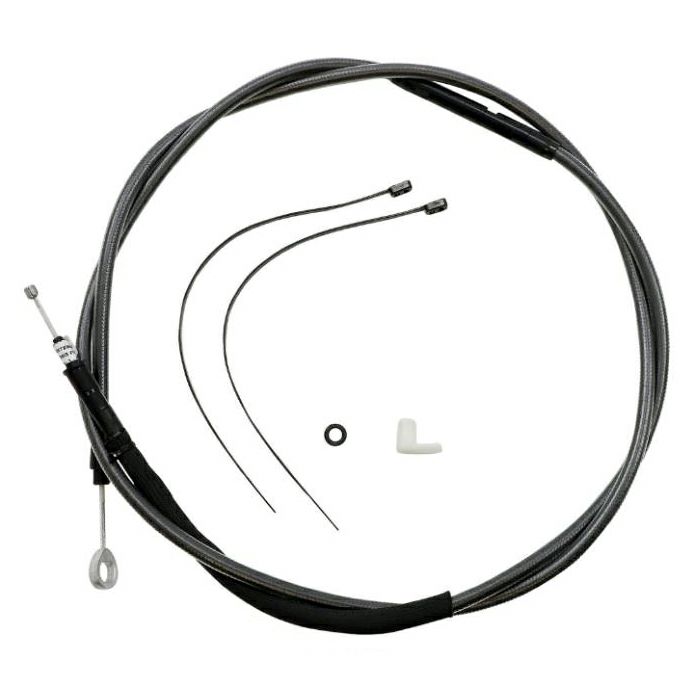 ハーレー ロードキング用 ハンドルケーブルキットです。 クラッチケーブルおよびアッパー・ブレーキラインのキットです。 ロワーブレーキラインはノーマルをそのまま使いますので、扱いやすく、コストパフォーマンスに優れたキットです。 更にスロットル配線、スイッチ配線が付属します。 ※グリップヒーター配線は付属しません。 18インチ~20インチのエイプハンドルに対応する長さです。 ブレーキラインはPTFEフッ素樹脂製チューブに丈夫なアラミドファイバー補強材の組み合わせです。 クラッチケーブルとブレーキラインはブラックパールカラー。 深いブラックのメッシュにクリアPVCジャケット仕様です。
