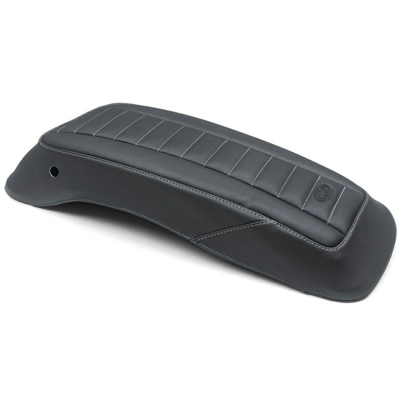 2014以降ハーレー Touringのハードサドルバッグリッドカバーです。 シンセティックレザー製。 センターストライプにはタックアンドロールステッチ入りのデラックスバージョンです。 ステッチカラーはシックなガンメタル(グレー)。 サドルバッグリッドを傷や汚れからガードすることは勿論、 同デザインのマスタングシートと組み合わると更にスペシャルなルックスにドレスアップ出来ます。 左右ペア