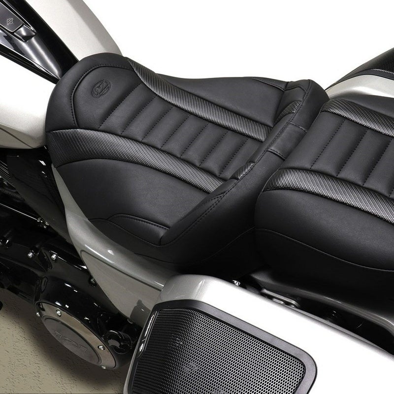 2023以降 CVOロードグライド/ST、CVOストリートグライド、2024以降 ロードグライド、ストリートグライド用 バックレスト付ソロシートです。 <特長> ●バケットシェイプの座面と、厚みのある高密度シートフォームが長距離ライディングでの快適性を最大限に高めます ●着脱可能なバックレスト付。高さ、角度の調整機構付きでライダーの背中をサポートします ●ノーマルシートよりも1.75(約4cm)インチ後ろに座ることが可能ですので、クルージングではリラックスしたポジションを取れます ●シート表皮はプリーツステッチのセンターパネルとカーボン柄のパネルを組み合わせた、高級感溢れるルックスです ●頑丈なグラスファイバー製シートベースが長時間の乗車でもシートフォームの型崩れを防ぎ、ポリウレタンバンパーが振動を吸収することで快適な乗り心地を維持します ※写真のパッセンジャーシート、ツアーパックバックレストは別売です。