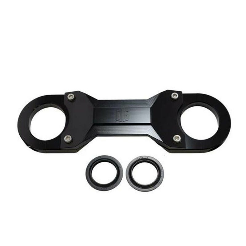 2013年以前 ツーリングの41mm径 正立フォーク車用 フォークブレースです。 <特長> ●ハイスピード走行時のギャップや路面のうねりによるフォークのねじれ、ウォブルの発生を抑え、安定感がアップします ●41mm 正立フォーク用(適合参照) ●フォークカバーは取り外す必要があります。フォークダストシール付属 ●5ピース構造で、比較的容易に着脱可能です ●高強度 6061 T6ビレットアルミニウム製。CNCマシンによる削り出し加工で製作しています ●傷や腐食に強いハードアルマイト処理済み ●センターにはOriginal Garage Moto(オリジナルガレージモト)のイニシャルロゴが浮き彫りされています ●ステンレススチール製ハードウェアが付属します ※ノーマル19インチフロントホイールまで対応