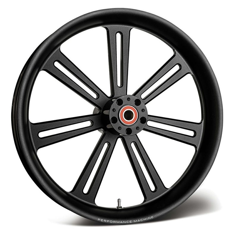 ハーレー ツーリングモデル用 鍛造アルミフロントホイールです。 センター部分にスリットが入った7本のスポークがアグレッシブな、山道のワインディングを疾走するイメージのデザインです。 テクスチャーブラックと、グロスブラックのコントラストの、ブラックOPSカラー。 リムサイドのPERFOAMANCE MACHINEロゴが走る気分を盛り上げます。 サイズは21x3.5インチ。フロント用。 ダブルディスク仕様。 ABS装着車用。 2014以降モデル用のフェンダーかさ上げブラケットが付属します。 ※2020以降のTPMS装着車は別売ブラケット(0076-2011)が必要です。 ※同シリーズリアホイールとのセット写真は参考です。