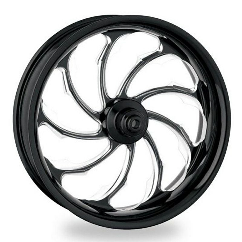 弧状のナイフのようなスポークが特徴のホイールです。 停車時でもスピード感が感じられます。 また、軽くて非常に強い材料強度を誇り、デザイン性を高めるためカット後に再研磨されています。 フロント用 サイズは21 x 3.5インチ ダブルディスク車用 ABS装着車用 ※スポークマウントディスクは使用できません。(PMディスクへの変更が必要です。)
