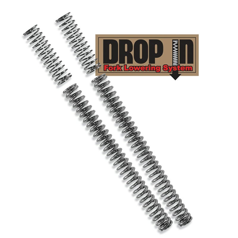 フロントサスペンショを低くするためのフォークスプリングです。 取付けはフォークチューブキャップを外してノーマルのスプリングと交換します。(ノーマルスペーサー、ダンパーその他スプリング以外のパーツはノーマルをそのまま使用します) フォークを脱着したりフォークオイルを抜いたりの作業は基本的に不要です。 下げ幅は1インチ~最大2インチ。 付属のスペーサーをそのまま入れると1インチ下がり、スペーサーを使用しない場合、2インチ下がります。付属のスペーサーを好みの長さに切って調整することも可能です。 ※下げ幅に応じたフォークオイル油面レベルの確認、調整が必要です。 左右ペア