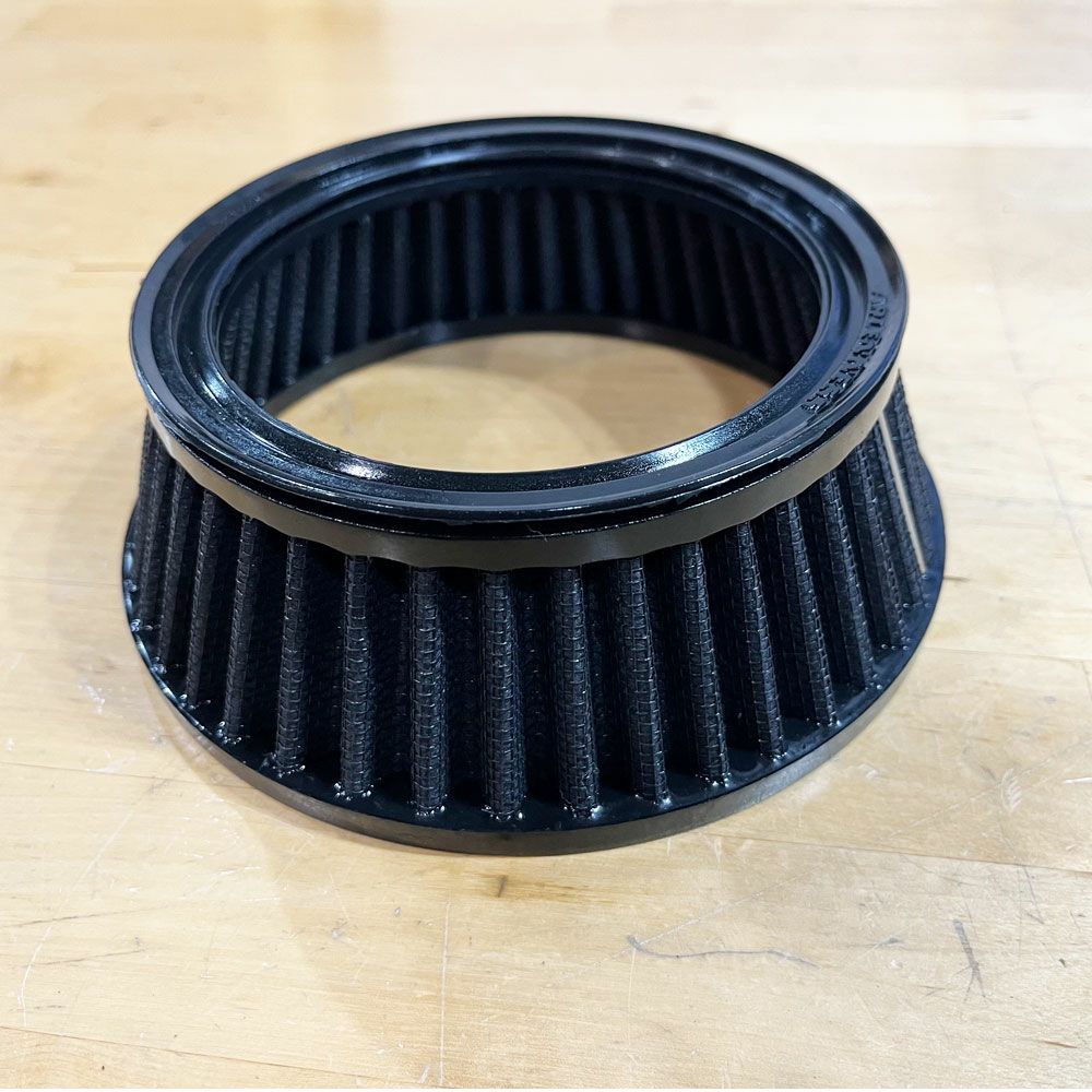 空気抵抗を下げ吸入空気量を増大させます。 RoughCraftsのエアクリーナーはArlenNess製のエアクリーナーバックプレートとフィルターを使用しています。 このエアクリーナーで使用しているアレンネス製バックプレートは他社とは構造が異なります。 従来のハイフローエアクリーナーでは、エアクリーナーからブローバイのオイルが漏れてきたり、 ブローバイガスに含まれるオイル成分がそのままエアクリーナーからインテークに戻されて、エンジン内部の汚れを発生させている物が多かったのですが、 このエアクリナーにはアメリカで特許取得済みのブローバイ・オイル低減機構が組み込まれ、バックプレートにオイルキャッチ機構があり、オイル成分がそのまま吸い込まれないようにしています。 その為、エンジン内部の汚れが大幅に低減されます。 エアフィルターは定期的に清掃が必要になりますが、その時に一緒にオイルキャッチに溜まったオイル分を拭き取ります。 吸入エアが増大するので、fp4などでインジェクション・チューニングをお勧めします。 ●バックプレート一体型のブリーザーシステムですので、ブリーザーホースの無いクリアな外観です。 ●エアフィルターはシンセティック素材。洗浄して繰り返し使用できます。 ※フィルターの色はハイフローフィルター専用オイルの色です。ブラックオイルを使用すれば黒色になります。 フィルターを交換する場合は「18-090」をご利用下さい。 ●レインソックスはアレンネス インバーテッド用(18-062)が使用出来ます。 ※ツインカムエンジン、電子制御スロットル車用。 ※マットブラックはメーカーでもリリースされていないカラーです。こちらはワールドモーターライフで独自にパウダーコート処理したカラーです。 ※装着画像はブラックツヤ有りの参考画像です。