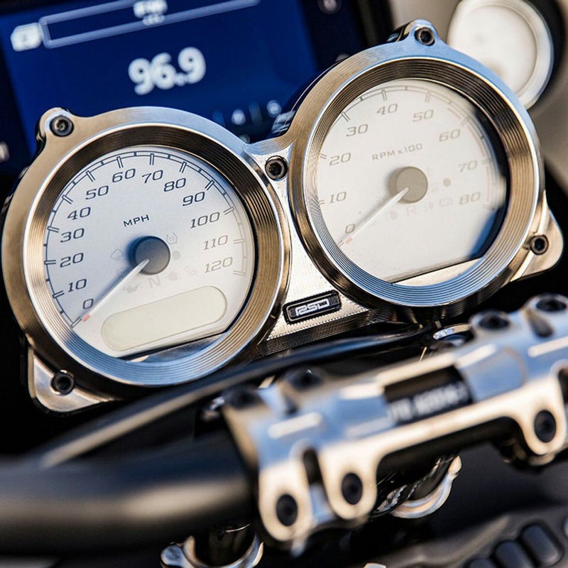 ハーレー ロードグライドに標準装着のメーターを、ライザーにマウントする、移設キットです。 1.25インチ径のライザーやTバーへマウント可能です。 特にローランドサンズデザインのSECTOR(セクター)シリーズのライザーにデザインマッチします。 高品質な6061アルミニウム製。CNCマシンによる削り出し加工品です。 ゲージハウジングはロープロファイルでスリムなルックスです。 ライザーの前後いずれの側にも装着出来ます。 取付け場所に応じてアームとゲージの角度を調整できます。 ※ライザーは付属しません