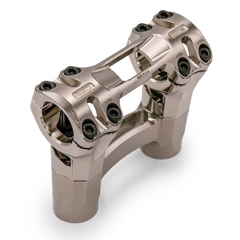 ハーレー用 1.125インチ径 ストレートライザーです。 このライザーは各パーツがモジュラー化されており、組み合わせにより高さ、プルバック/ストレート、トップブリッジワンピース/ツーピースの多くのバリエーション展開されています。 高品質の6061アルミニウム製。CNCマシンによる精緻な仕上がりで、ライザーだけでもスペシャルな雰囲気満載の製品です。 カラーはニッケル。周辺のブラックパーツ、クロームパーツのいずれにもマッチします。 クランプは1.125インチ径。流行りの1.125インチ径モトスタイルハンドルバーを装着出来ます。 トップクランプはワンピースタイプ。左右合計8本のボルトでしっかりとクランプしつつ、スリムな2本ブリッジの質感の高いデザインと仕上がりです。 ブラックのステンレス製クランプボルトが付属します。 ライザーボルトは多くのハーレーで使われる1/2-13サイズを使用。 ※ライザーボルトは付属しません。
