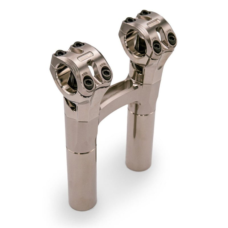 ハーレー用 1.125インチ径 ストレートライザーです。 このライザーは各パーツがモジュラー化されており、組み合わせにより高さ、プルバック/ストレート、トップブリッジワンピース/ツーピースの多くのバリエーション展開されています。 高品質の6061アルミニウム製。CNCマシンによる精緻な仕上がりで、ライザーだけでもスペシャルな雰囲気満載の製品です。 クランプは1.125インチ径。流行りの1.125インチ径モトスタイルハンドルバーを装着出来ます。 トップクランプはツーピースタイプ。左右各4本のボルトでしっかりとクランプます。 ライザー中間部分は左右を繋ぐブリッジ付き。 ブラックのステンレス製クランプボルトが付属します。 カラーはニッケル。周囲のブラックパーツ、クロームパーツ共にマッチします。 ライザーボルトは多くのハーレーで使われる1/2-13サイズを使用。 ※ライザーボルトは付属しません。