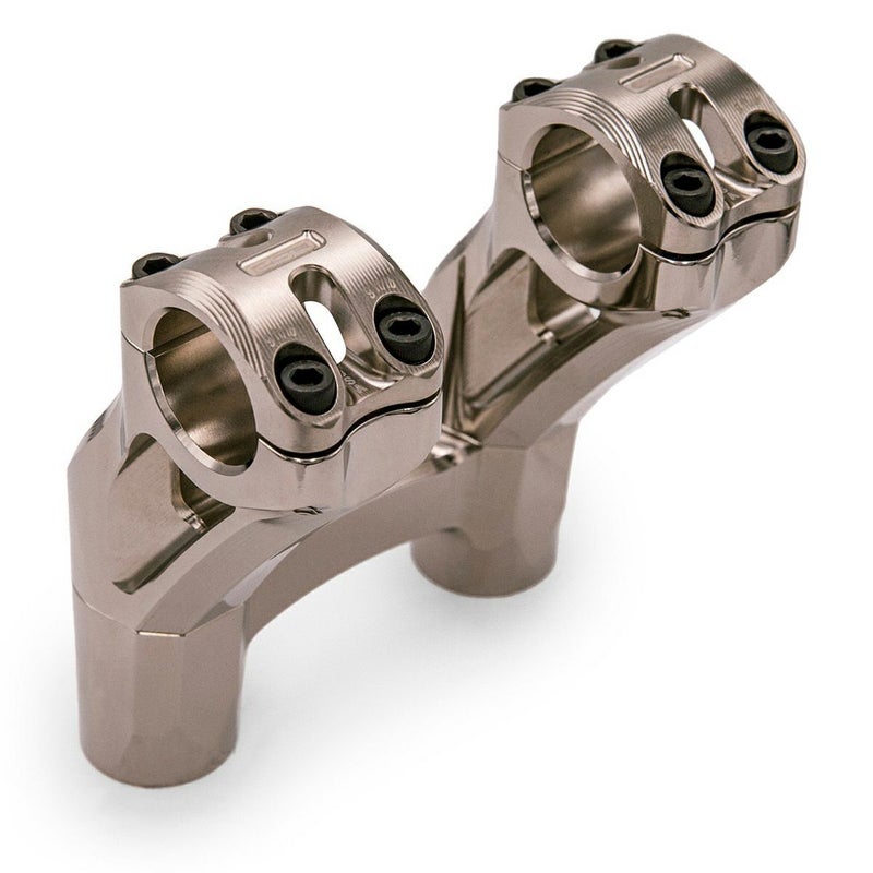 ハーレー用 1.125インチ径 プルバックライザーです。 このライザーは各パーツがモジュラー化されており、組み合わせにより高さ、プルバック/ストレート、トップブリッジワンピース/ツーピースの多くのバリエーション展開されています。 高品質の6061アルミニウム製。CNCマシンにより精緻な仕上がりです。 クランプは1.125インチ径。流行りの1.125インチ径モトスタイルハンドルバーを装着出来ます。 トップクランプはツーピースタイプ。左右各々4本のボルトでしっかりとクランプしつつ、シンプルで質感の高いデザインと仕上がりです。 ブラックのステンレス製クランプボルトが付属します。 ライザーボルトは多くのハーレーで使われる1/2-13サイズを使用。 ※ライザーボルトは付属しません。