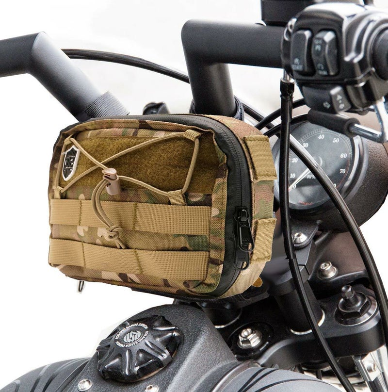 ハーレー用の丈夫なバーバッグです。 600デニールのMILスペック・バリスティックナイロン製。 水や汚れに強く、かつ軽量です。 ジッパーは防水仕様。 前面と側面・背面に2インチ幅/1インチ幅のMOLLEシステム付。 更に前面にはベルクロテープとドローコード付。 内部はジッパーポケットおよびメッシュポケット。更に伸縮性MOLLEシステムとキーリングが付いていますので、小物の整理収納に便利です。 4本のベルクロストラップ付属。色々な装着方法が可能です。