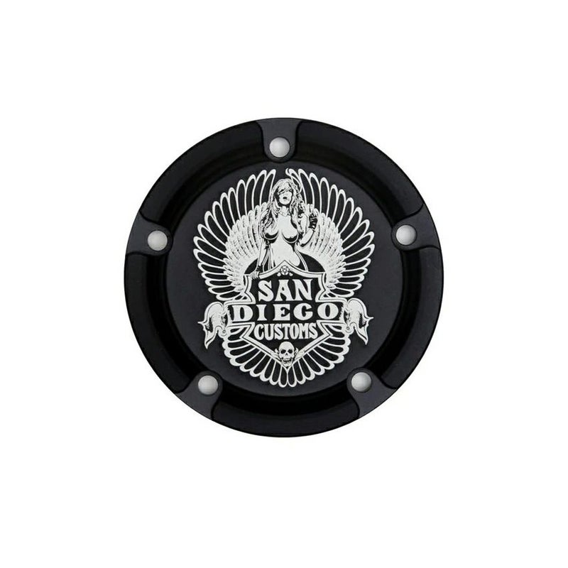 ハーレー ツインカムエンジン用のタイマーカバーです。 ビレットアルミニウム製。CNCマシン削り出し品。 ベースカラーはマットなステルスブラック。 ブラックのベースに、女神とSAN DIEGO CUSTOMSのロゴがエッチングされています。
