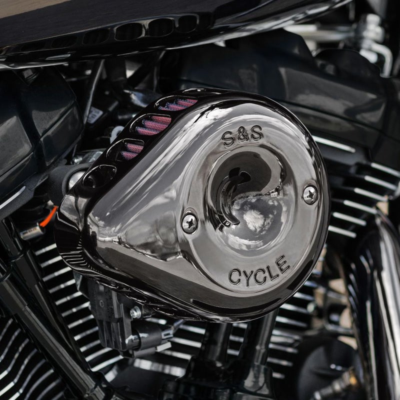 ミルウォーキーエイトモデル用のステルスエアクリーナーキット。 S&Sのアイコンといえる、ティアドロップタイプのエアクリーナーカバーよりも、15%小ぶりなグロスブラック仕上げのミニティアドロップカバーが特徴です。 カバーの側面にスリットが入っており、デザイン上のアクセントとなっており、同時にエア吸入量を増やしています。 高強度のポリマー製バックプレートによって、吸入するエアの温度上昇を抑え、密度の高いエアをシリンダーに送り込みますので、エンジンパフォーマンスを高めます。 アクチュエーターカバーが付属しており、サーボモーターを隠しますので、すっきりと綺麗な外観になります。 標準装備のミルウォーキーエイトエアクリーナーカバーも装着可能です。(別売の170-0352が必要です。)