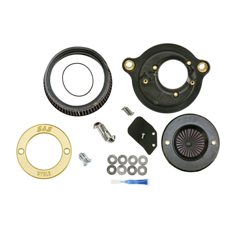 エアの取り込みを、これまでの側面に加え、前面からも吸気することで、更に大量の空気を取り込めるエアクリーナーです。 ステルス用エアフィルターに加え、前面のフィルタープレートが加わり、ノーマル比55パーセントアップのエアを取り込めます。 前面のフィルターもステルスエアフィルターと同様に繰り返し洗浄して使用できます。 S&Sのロゴ入りリングプレート付です。 ※装着写真は他車両になります。