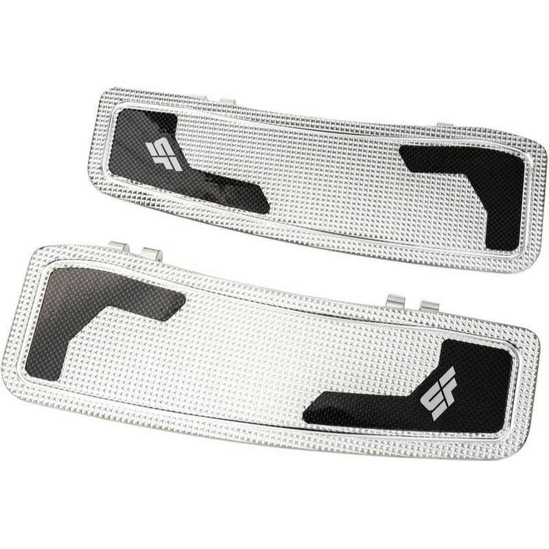 ツーリング、FLソフテイル、ダイナスイッチバック用 パフォーマンスバガー仕様のライダーフロアボードです。 <特長> ●フルサイズのフロアボードながら、底面を外側に向けて段差をつけた形状とすることでバンク角も確保しています ●ビレットアルミニウム製。ダイアモンドカットの滑り止め模様入り ●スポーティーなアルミポリッシュ仕上げ ●カーボンファイバーのトリムインサートがデザインアクセント。ポリウレタン樹脂の保護フィルム付です ●前後ポジションを3段階に調整できます ●左右ペア