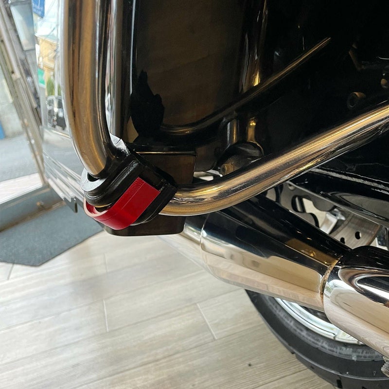 サドルバッグガード用の傷防止プロテクター。 1インチ径のサドルバッグガードに装着可能です。 転倒した際にエンジンガードやサドルバッグガードに傷が付くのを防ぎます。 また車両のワンポイントカスタムにもなるスタイリッシュなデザインです。 プロテクター本体の平らな部分に切れ込みが入ってるので、ガードパイプに被せて付属のU字型のロックで固定して取り付けます。 ガッチリ固定出来るように、かなりタイトな作りになっています。 サドルバッグガード用x2個セット。 旧型番:EGP-RED-1